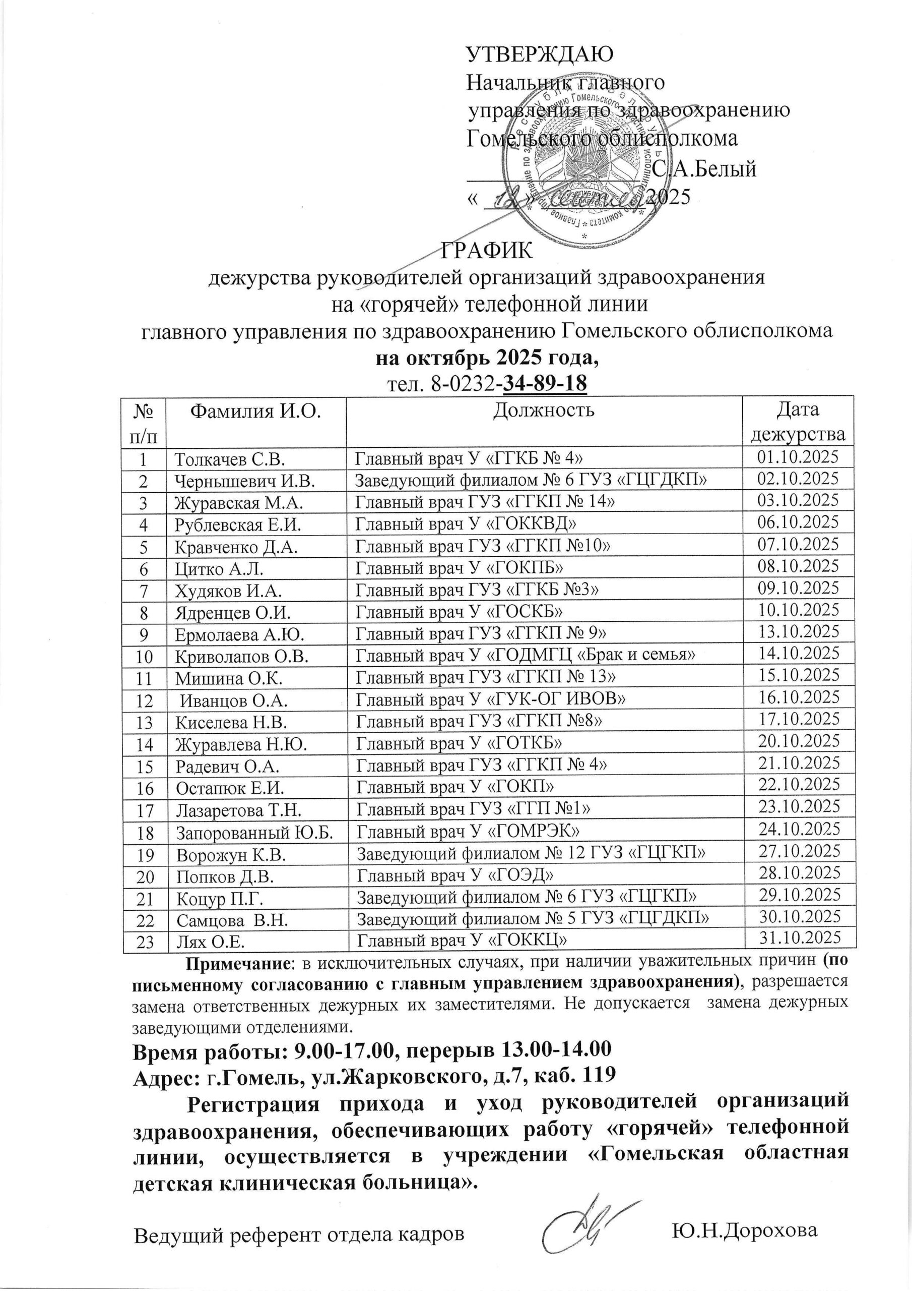ГРАФИК дежурства руководителей организаций здравоохранения на “горячей” телефонной линии главного управления здравоохранения на года, тел 8-0232-34-8918