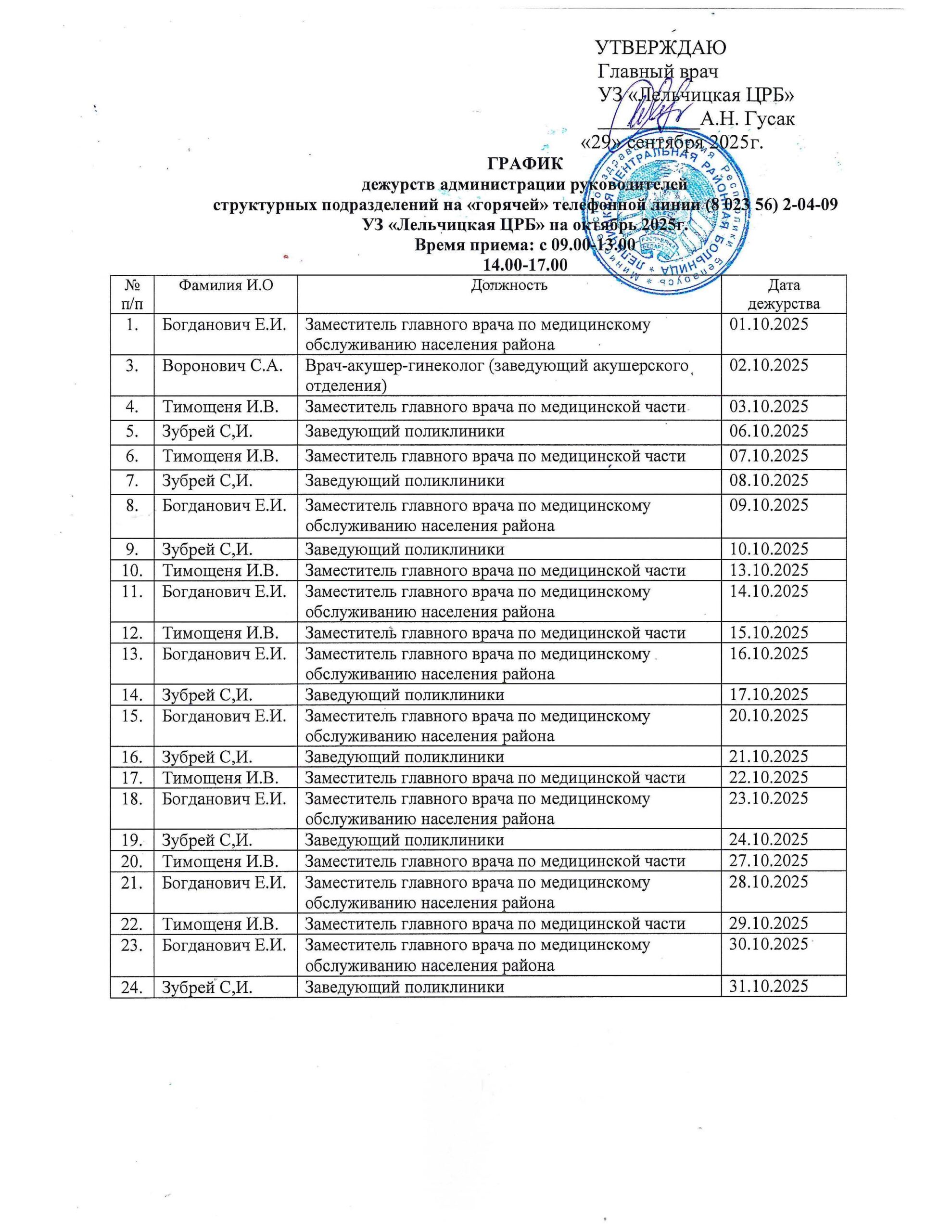 ГРАФИК дежурств администрации руководителей структурных подразделений по горячей телефонной линииlelzrb2025-10-01T06:08:27+00:00